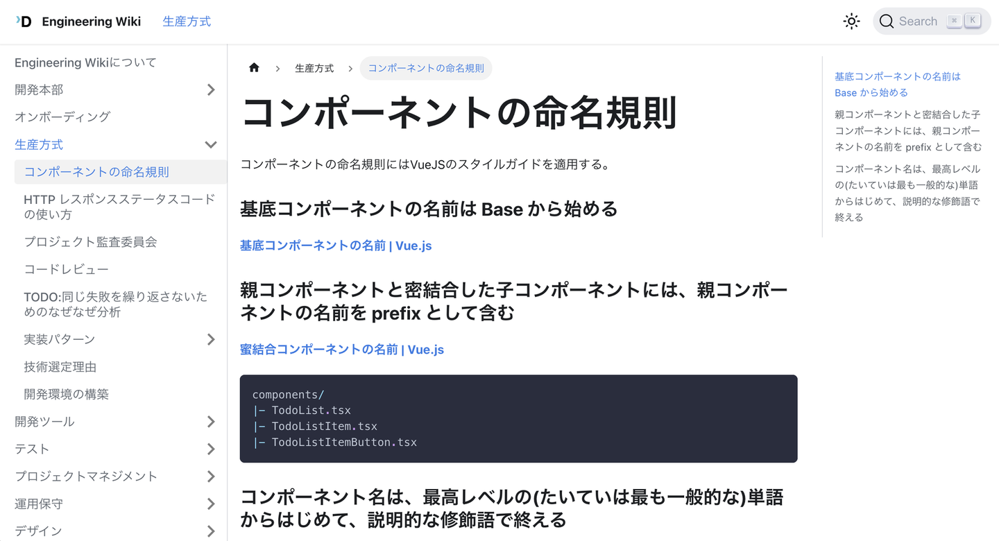 Engineering Handbookでは、システムの実装パターンや開発ツールの運用方法、プロジェクトマネジメントのハンドブックなど業務上必要なあらゆる知見をドキュメント化しています。アクションの度にドキュメント化することは短期的なコストが発生しますが、コミュニケーションコストの低下、サービスの品質向上という観点から長期的に大きな効果があると考えています。