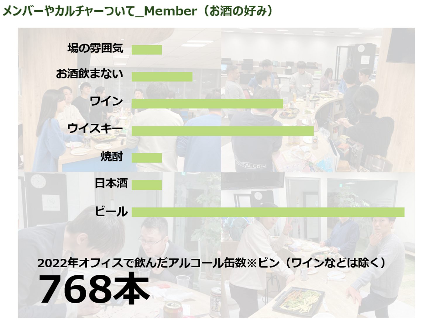 仕事後に気軽にみんながあつまって飲みながら話す機会が出来ればよいなと。そしたら自然とアルコール消費本数も増えるのでは、という理論です。