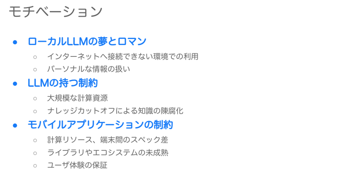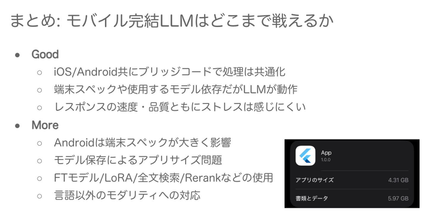 スマホ単体で、しかもネットに繋がずにAIを動かすという発表でした!RAGを使って、AIが知らない知識を補う仕組みを実装。アプリサイズが10GB弱になっちゃうという課題も「壁があるからこそ面白い」というエンジニア魂を感じました。