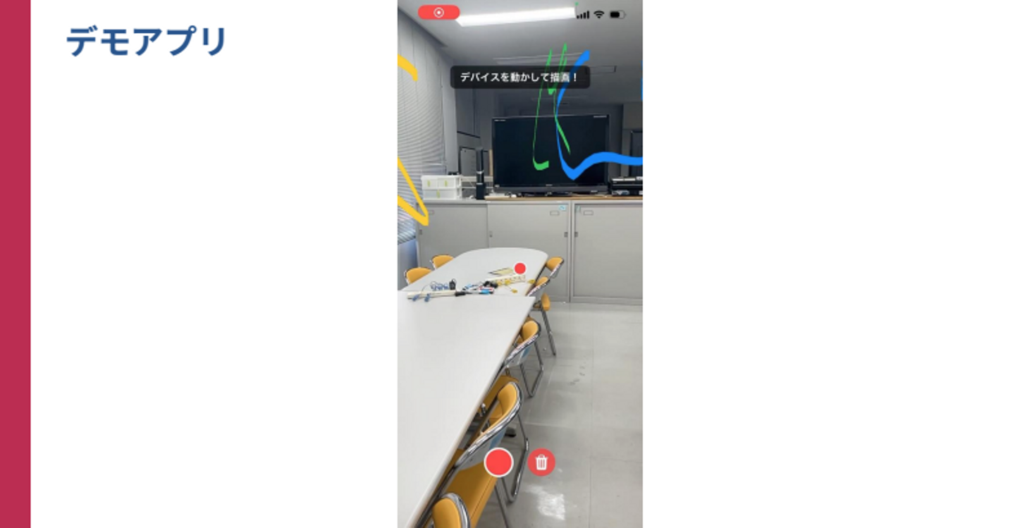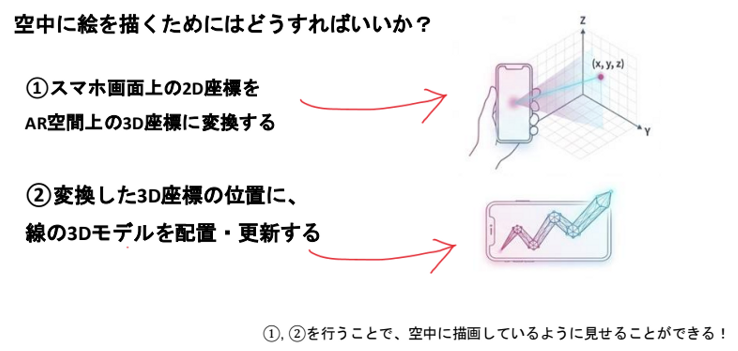 スマホをペンのように動かして、空中に立体的な絵が描けるARアプリ!2Dの座標を3Dの「ワールド座標」に変換する魔法のような仕組みを解説してもらいました。1フレームごとに三角形を繋いで線にしていきます!実際に空間に絵が浮いているデモを見て、会場も盛り上がりました!
