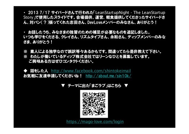 - 2. ・ 2013 7/17 サイバードさんで行われた「LeanStartupNight - The LeanStartup Story」で使用したスライドです。会場提供、運営、軽食提供してくださったサイバードさ ん、対バン(?)張ってくれた志田さん、DevLoveメンバーのみなさん、ありがとう! ・ お話したうち、みなさまの独習のための補足が必要なものを追記しました。 いつも学びをくださる、クレイさん、リズムタイプさん、永和さん、ディップメンバーのみな さま、ありがとう! ※ 素人による独学なので誤訳等々あるかもです。間違ってたら是非教えて下さい。 ※ わたしが働いているディップ株式会社ではリーンなひとを募集しています。 ご興味ある方はぜひコンタクトください。 ◆ 話をした人 http://www.facebook.com/shintokeimail お気軽に友達申請してくださいね! http://about.me/sin10k/ ▼ テーマに出た「まごラブ」はこちら ▼ https://mago-love.com/login