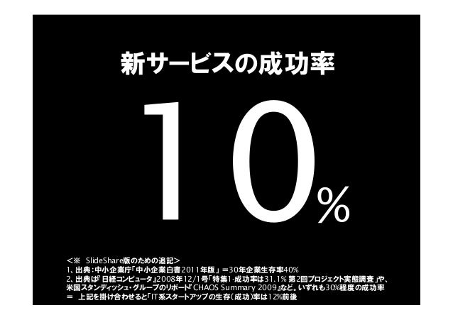 - 23. % 新サービスの成功率 <※ SlideShare版のための追記> 1、出典:中小企業庁「中小企業白書2011年版」 =30年企業生存率40% 2、出典は『日経コンピュータ』2008年12/1号「特集1-成功率は31.1% 第2回プロジェクト実態調査」や、 米国スタンディッシュ・グループのリポート『CHAOS Summary 2009』など。いずれも30%程度の成功率 = 上記を掛け合わせると「IT系スタートアップの生存(成功)率は12%前後