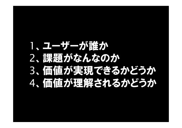 - 30. 1、ユーザーが誰か 2、課題がなんなのか 3、価値が実現できるかどうか 4、価値が理解されるかどうか