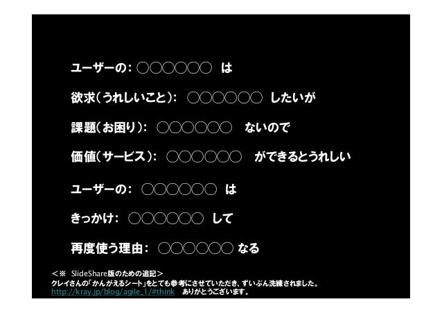 - 43. ユーザーの: ◯◯◯◯◯◯ は 欲求(うれしいこと): ◯◯◯◯◯◯ したいが 課題(お困り): ◯◯◯◯◯◯ ないので 価値(サービス): ◯◯◯◯◯◯ ができるとうれしい ユーザーの: ◯◯◯◯◯◯ は きっかけ: ◯◯◯◯◯◯ して 再度使う理由: ◯◯◯◯◯◯ なる クレイさんの「かんがえるシート」をとても参考にさせていただき、ずいぶん洗練されました。 http://kray.jp/blog/agile_1/#think ありがとうございます。 <※ SlideShare版のための追記>