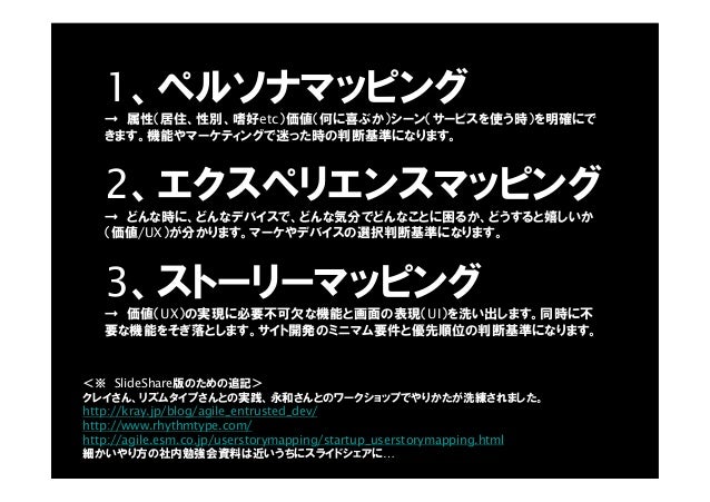 - 45. 1、ペルソナマッピング → 属性(居住、性別、嗜好etc)価値(何に喜ぶか)シーン(サービスを使う時)を明確にで きます。機能やマーケティングで迷った時の判断基準になります。 2、エクスペリエンスマッピング → どんな時に、どんなデバイスで、どんな気分でどんなことに困るか、どうすると嬉しいか (価値/UX)が分かります。マーケやデバイスの選択判断基準になります。 3、ストーリーマッピング → 価値(UX)の実現に必要不可欠な機能と画面の表現(UI)を洗い出します。同時に不 要な機能をそぎ落とします。サイト開発のミニマム要件と優先順位の判断基準になります。 クレイさん、リズムタイプさんとの実践、永和さんとのワークショップでやりかたが洗練されました。 http://kray.jp/blog/agile_entrusted_dev/ http://www.rhythmtype.com/ http://agile.esm.co.jp/userstorymapping/startup_userstorymapping.html 細かいやり方の社内勉強会資料は近いうちにスライドシェアに… <※ SlideShare版のための追記>