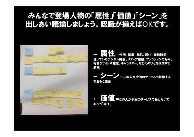 - 46. ← 属性=性別、職業、年齢、居住、通勤時間、 使っているデジタル機器、メディア接触、ファッションの好み、 好きなサイトや雑誌、キャラクター、などそのひとを構成する 要素 ← シーン=この人が今回のサービスを利用する であろう理由 ← 価値=この人が今回のサービスで受けたいで あろう「喜び」 みんなで登場人物の「属性」「価値」「シーン」を 出しあい議論しましょう。認識が揃えばOKです。