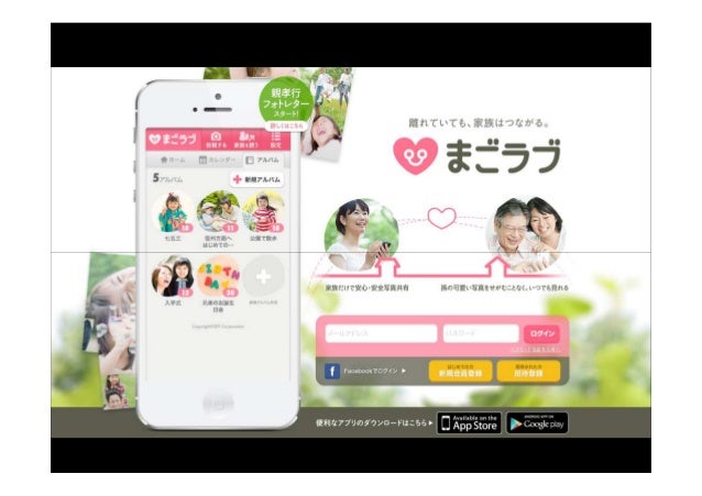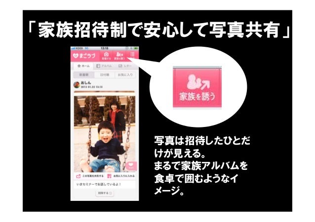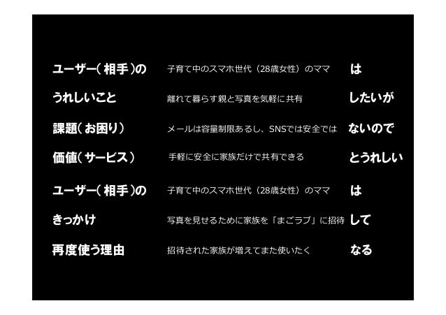 - 50. ユーザー(相手)の は うれしいこと したいが 課題(お困り) ないので 価値(サービス) とうれしい 子育て中のスマホ世代(28歳⼥性)のママ 離れて暮らす親と写真を気軽に共有 メールは容量制限あるし、SNSでは安全では 手軽に安全に家族だけで共有できる ユーザー(相手)の は きっかけ して 再度使う理由 なる 子育て中のスマホ世代(28歳⼥性)のママ 写真を⾒せるために家族を「まごラブ」に招待 招待された家族が増えてまた使いたく