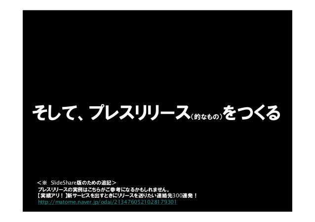 - 53. そして、プレスリリース(的なもの)をつくる プレスリリースの実例はこちらがご参考になるかもしれません。 【実績アリ!】新サービスを出すときにリリースを送りたい連絡先300連発! http://matome.naver.jp/odai/2134760521028179301 <※ SlideShare版のための追記>