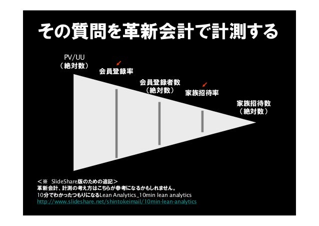 - 58. PV/UU (絶対数) 会員登録率 家族招待率 家族招待数 (絶対数) 会員登録者数 (絶対数) その質問を革新会計で計測する 10分でわかったつもりになるLean Analytics_10min lean analytics http://www.slideshare.net/shintokeimail/10min-lean-analytics 革新会計、計測の考え方はこちらが参考になるかもしれません。 <※ SlideShare版のための追記>