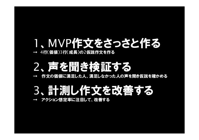 - 60. 1、MVP作文をさっさと作る → 4行(価値)3行(成長)の2仮説作文を作る 2、声を聞き検証する → 作文の価値に満足した人、満足しなかった人の声を聞き仮説を確かめる 3、計測し作文を改善する → アクション想定率に注目して、改善する