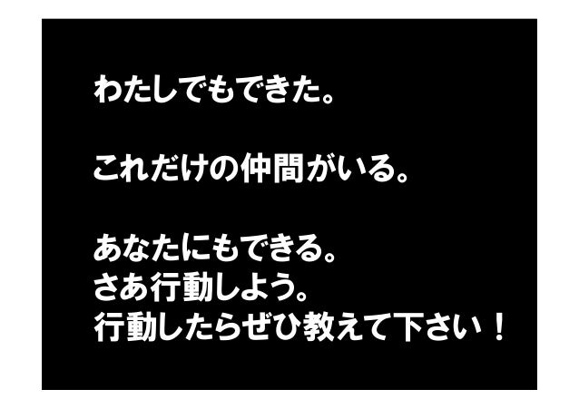- 88. わたしでもできた。 これだけの仲間がいる。 あなたにもできる。 さあ行動しよう。 行動したらぜひ教えて下さい!