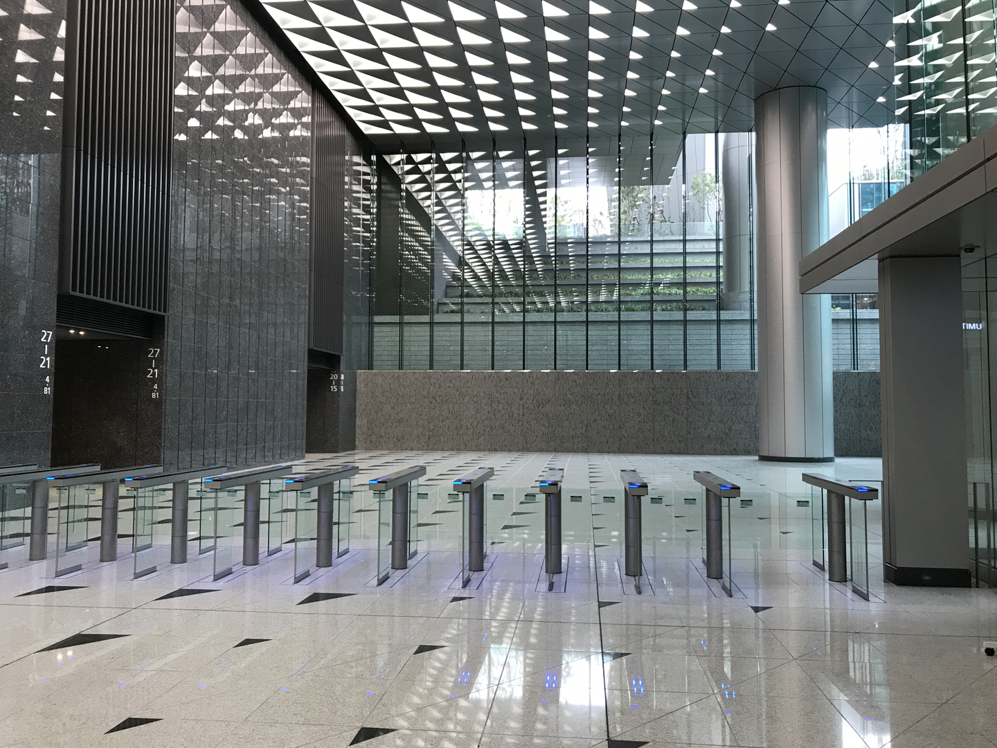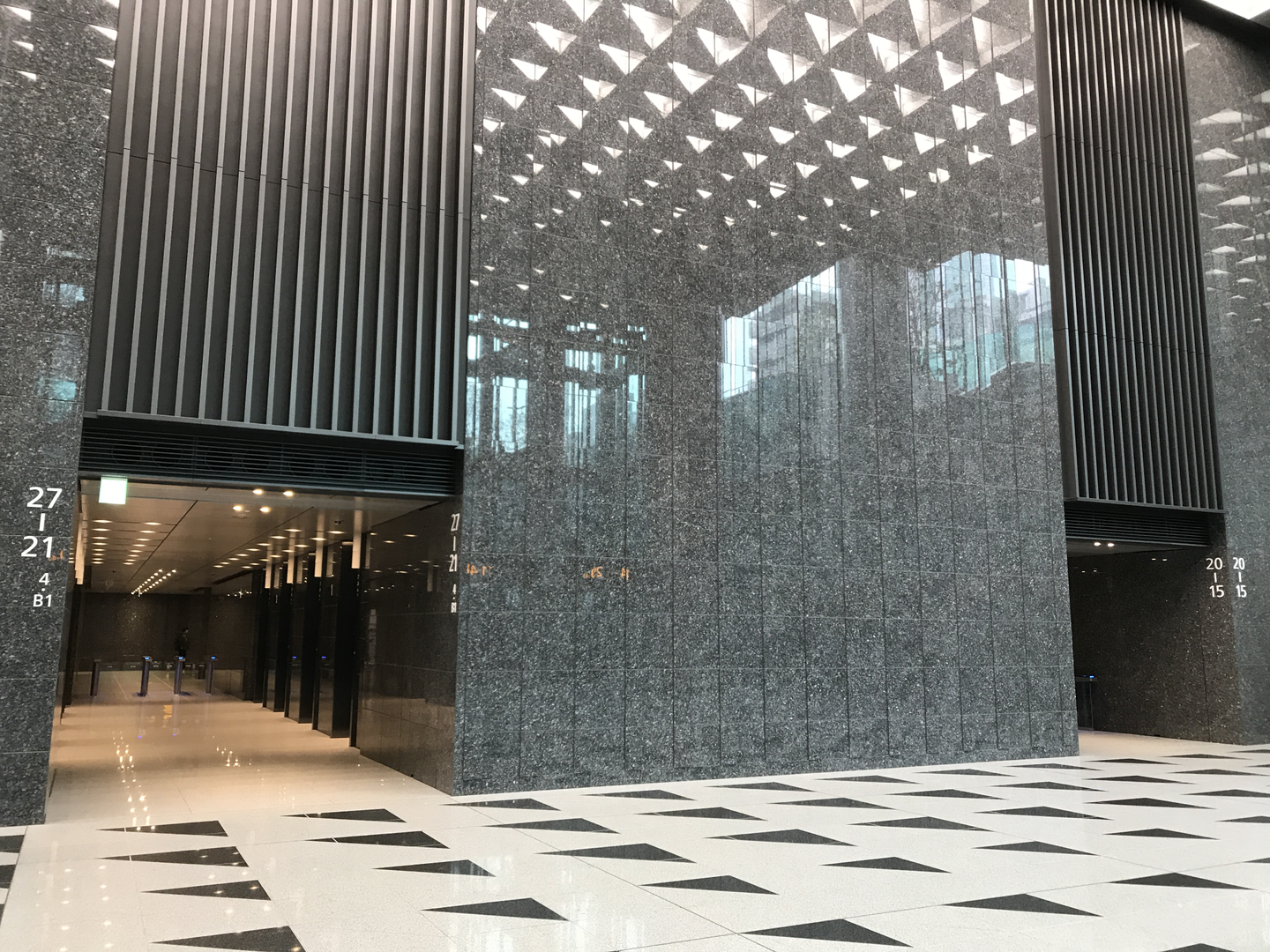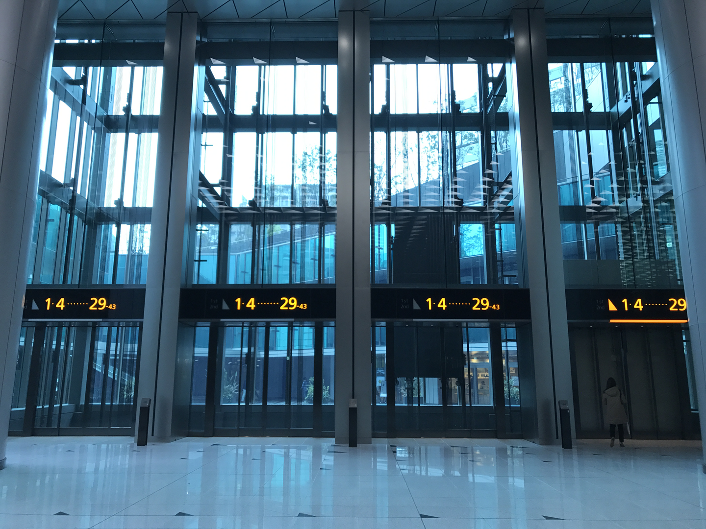 でかいのが4つ、4機?あります。このエレベーター日本1の大きさらしいですよ、人を載せるためのものだと。右にいるおねえさんとの対比で大きさはなんとなく伝わるでしょうか。