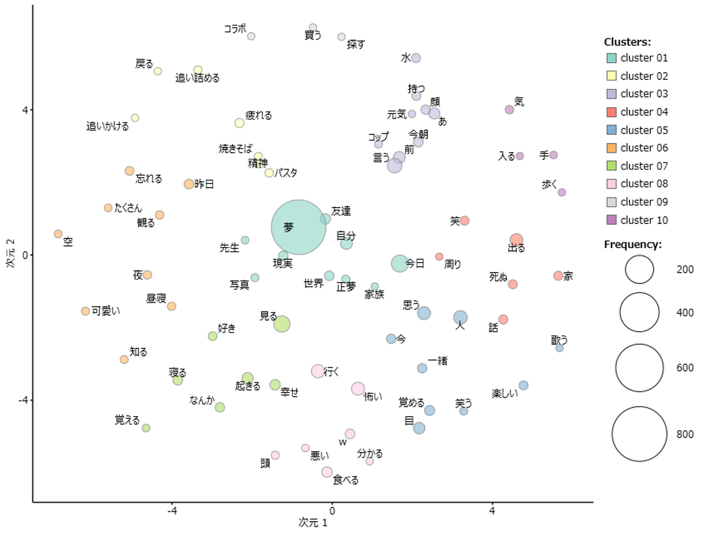 試しに夢についてのツイートを言葉ごとに区切って、「どんな言葉が多く出てきていて、どの言葉とどの言葉が一緒に使われていたのか」を図にプロットしてみるとこんな感じになります。