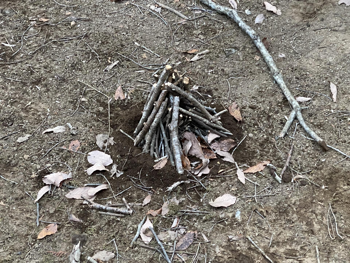 焚き火1つとってもデブリが必要、知恵が詰まっています。このような枝の組み方、葉っぱの入れ方じゃないと火がつかないし、長く火がもたないんです。