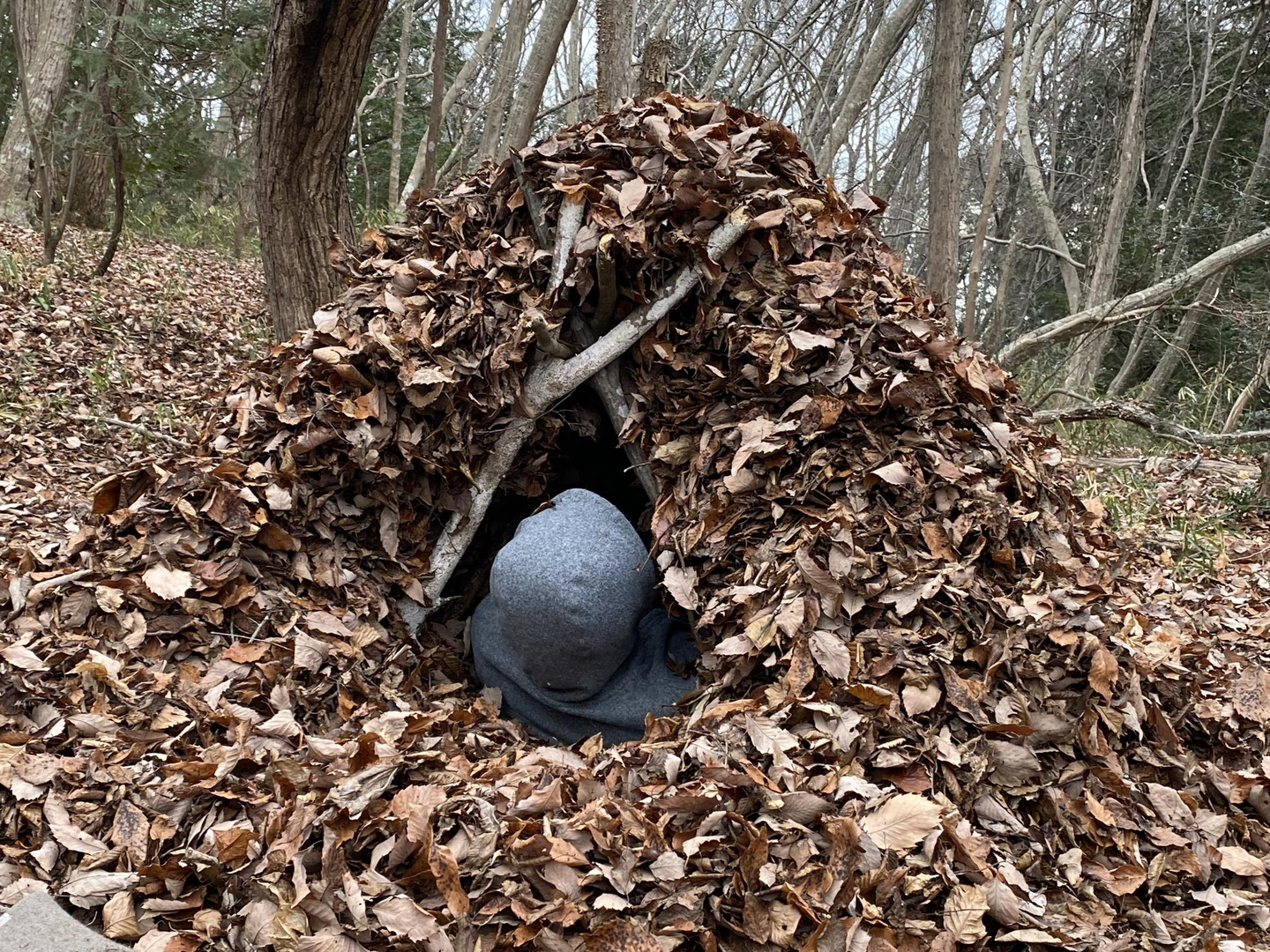 これは「デブリハット」というシェルターです。よく見ると枯葉の山に穴(入り口)が空いています。