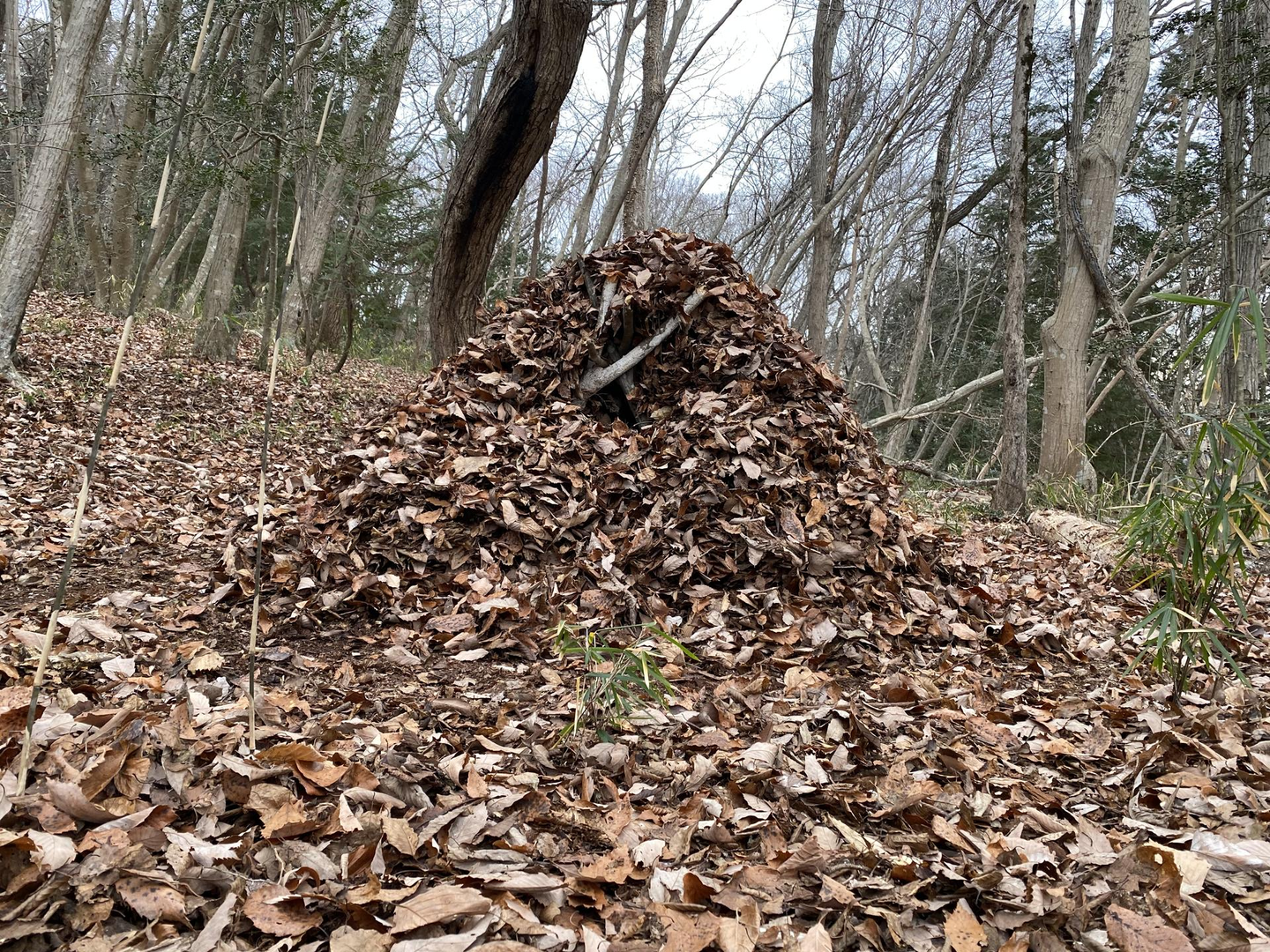 そこに枯葉を被していきます。細かい注意点などは割愛しますが、これは人間の体温を保持するための寝床(シェルター)です。