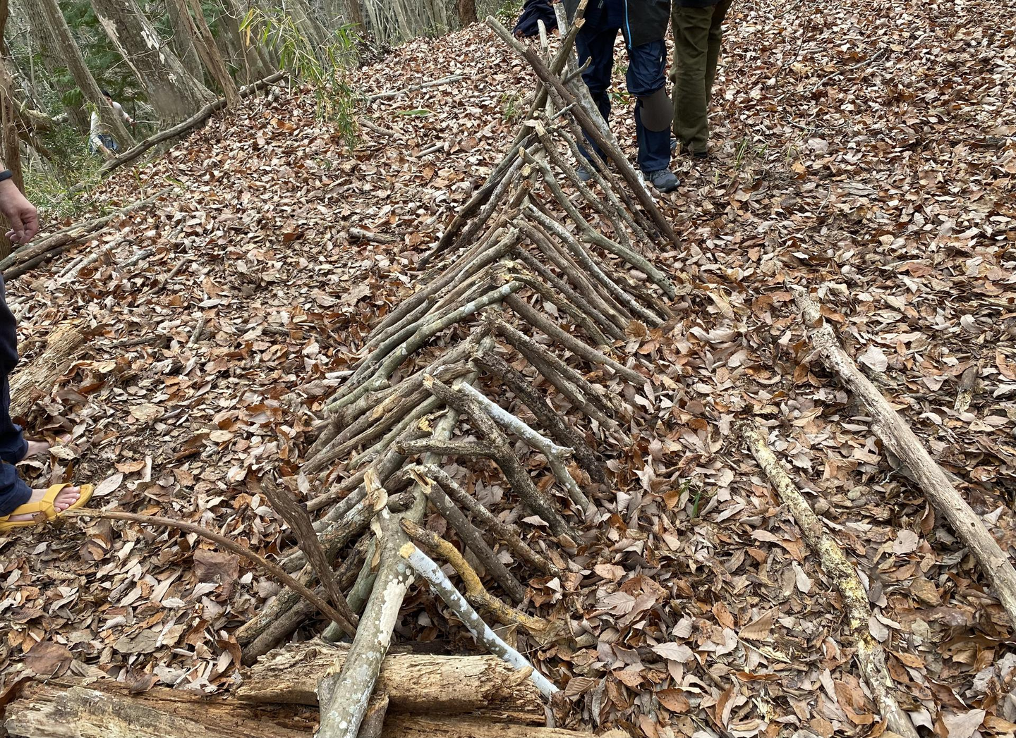 こんな骨組みです。人間の背骨に当たる太めの倒木を1本、入り口付近の2本の木で支える3点支えの構造で、さらに少し細めの木を並べ屋根を作ります。まさに肋骨のように。この骨組みのポジションとバランスをしっかりとらないと崩れますので注意が必要です。