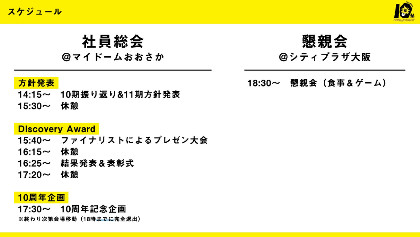 今年は経営陣からのメッセージをはじめ、各事業部の成果発表や、年間MVPを決める「Discovery Award」、そして10周年をお祝いする特別企画など盛りだくさん !