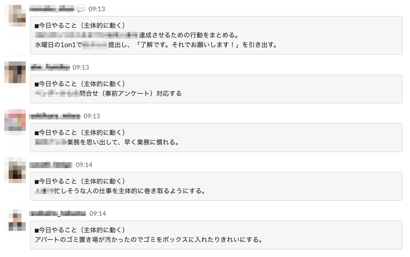 また、その日のアクションプランが決まったら、slackのクレド振り返り専用チャンネルにアクション内容の投稿をし、翌日に体現することができたかを振り返っています。