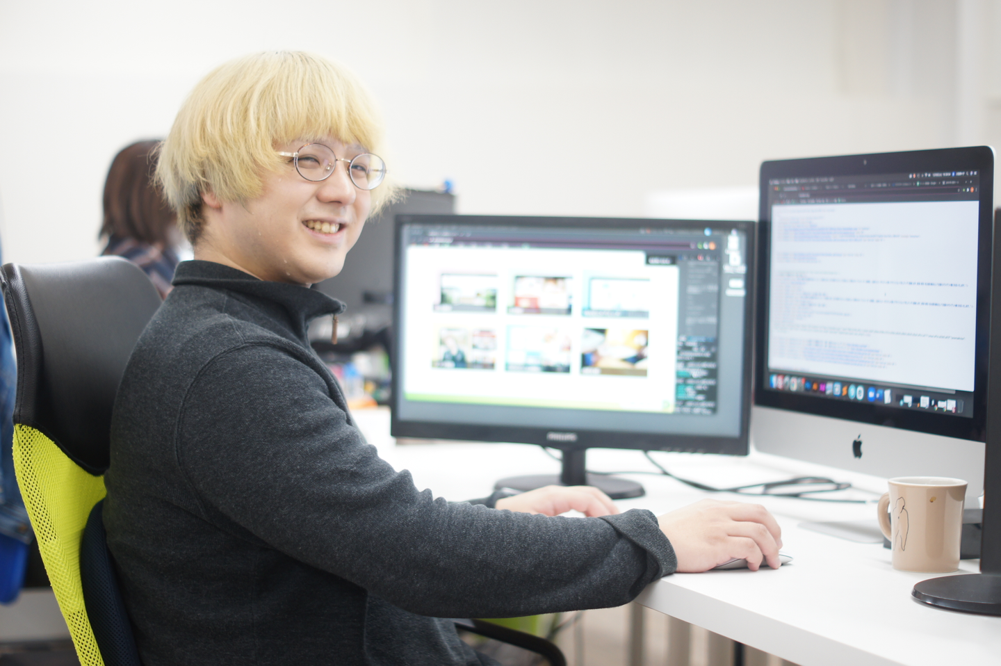 現在はコーディングチームの一員としてデザイナーが作成したデザインをもとにサイトの構築を行いながら、教育係として後輩に社内ルールや構築についての教育も行っています。