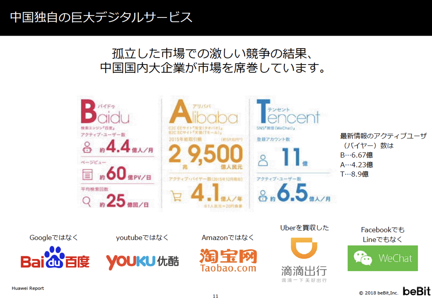 中国3大インターネット企業BATと呼ばれる、バイドゥ、アリババ、テンセント。上の数字をみてわかるように数字の桁が我々日本人からするとぶっとんでいるようにかんじます。アリババの2018年現在の時価総額は世界6位(約54.9兆円)に、テンセントは8位(54.4兆円)に。とにかく昨今の中国企業は驚くべき成長を遂げております。 中国にはGreat Firewall(https://cybersecurity-jp.com/security-measures/6729)という他国との情報規制があります。この時代にそんな規制して何やってるのか、とても理解し難かったのですが、結果として、国内の産業政策を成長させているのです。そして、BAIDU、Alibaba、テンセント、が生まれ、今では世界の時価総額トップ10に二社が入っている。全ては国策「国内産業の育成」から生まれているわけです。政治インパクトを感じずにいられません。