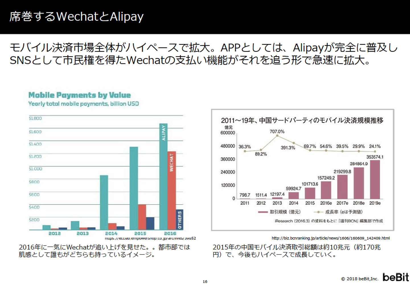 空港からビービットさんの上海オフィスにむかい、ランチ後すぐに座学が始まります。ここでは、数字で今の中国について学び、キャッシュレス経済中国の構造について理解を深めていきます。 数字については、簡単に下記にまとめます。 ・インターネットユーザー:7億3千万人・モバイルユーザー:うち95%の6億9千万人・都市部のスマホ普及率:97%〜99%※日本:64%、韓国:92% 、アメリカ:78%・モバイル決済プラットフォーム利用率:98.3%※日本の店頭でのモバイル決済率は6%