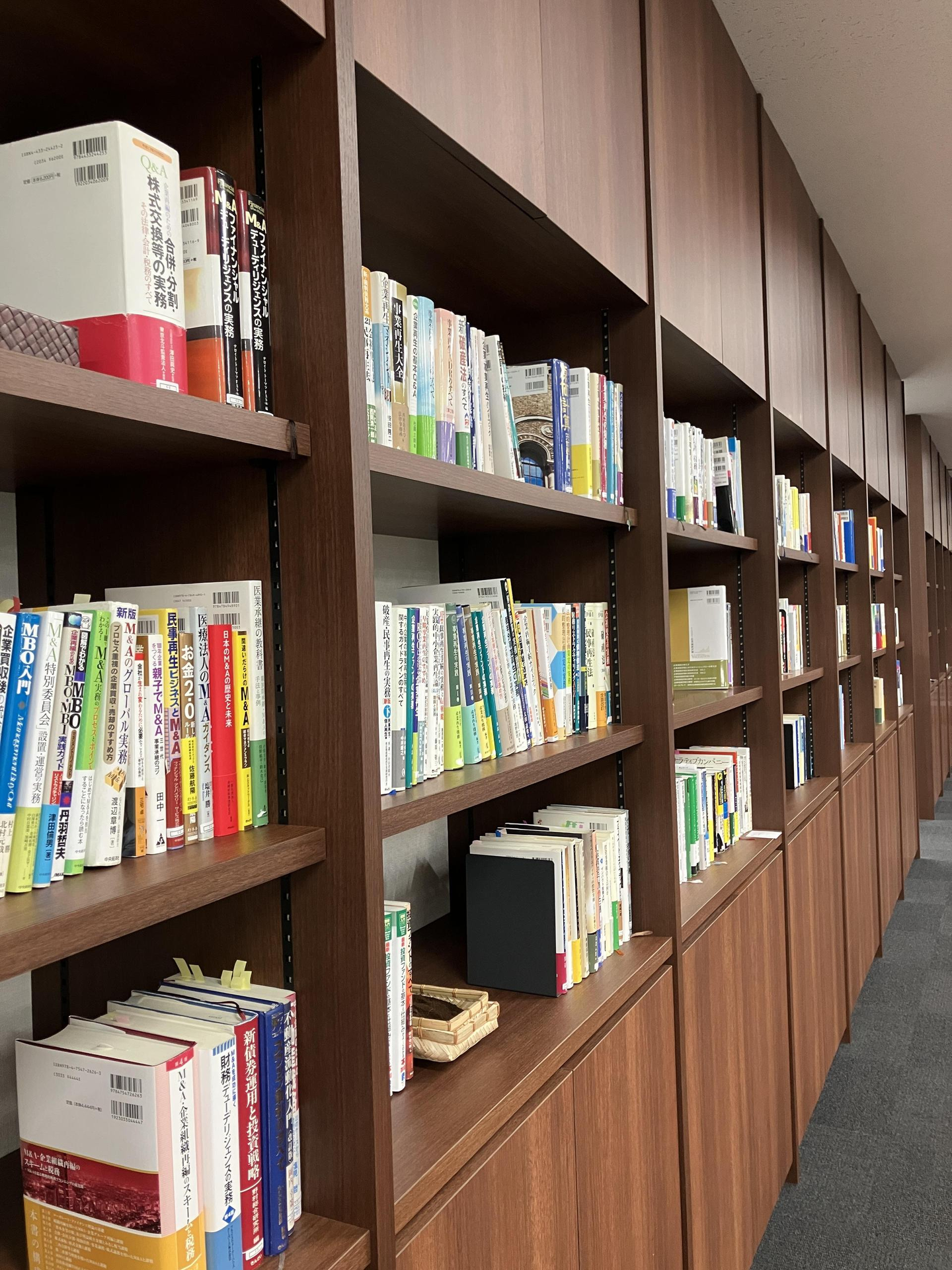 執務エリアの一角には、壁一面に広がる「社内図書館」が!ビジネス書から専門書、話題の文芸書まで、650冊以上の本が読み放題。業務に必要な本は、会社が費用を負担して購入してくれるので、常に新しい知識を吸収できる環境です。