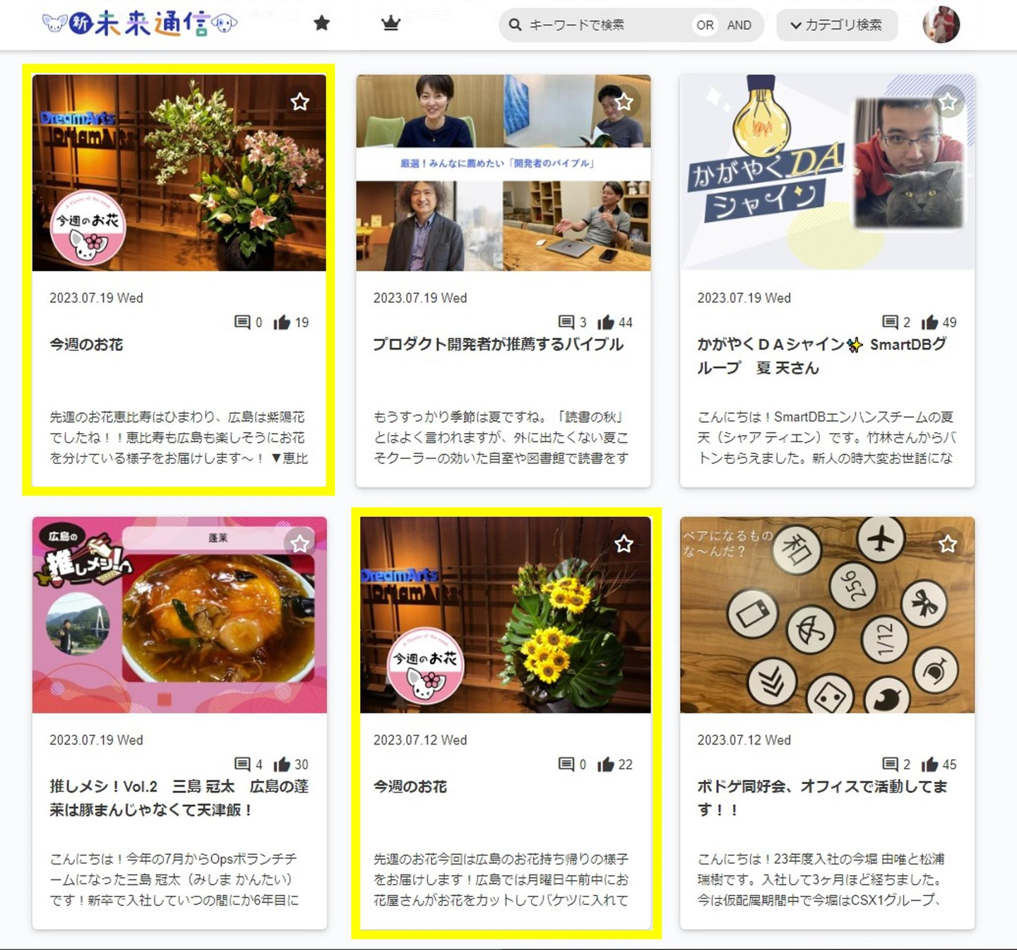装花スペースには、プロのお花屋さんに毎週月曜に代わる代わるお花をアレンジいただいています。ドリーム・アーツではリモートワークを取り入れており社員も適宜活用しているため、せっかく綺麗に咲いていても見てくれる人が減ってしまいもったいない!・・・ということで、リモートワークのメンバーの癒やしにもなるかと思うので、毎週社内報の「今週のお花」というコーナーでお花の写真を発信しています。