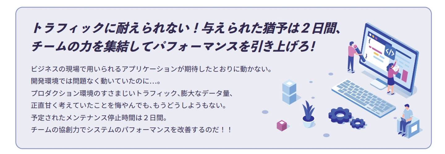 運用されたサービスのパフォーマンスが低く、営業やサポートは謝罪の毎日を送っているなかで、緊急メンテナンス期間が取れたという現役エンジニアにとってはなかなか胃が痛くなるような設定ですが、学生たちにとっては初めてのシチュエーションです。