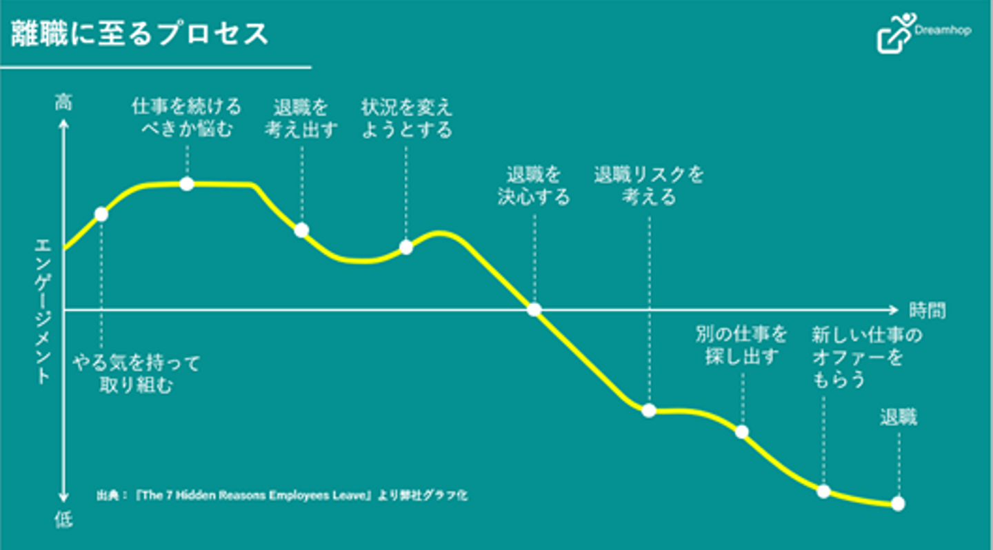 まず、従業員エンゲージメントと人材の定着を専門とするコンサルタントのレイ・ブランハム氏の著書『The 7 Hidden Reasons Employees Leave』では、各種調査の結果から、従業員が退職を決意した原因を追究し、その流れが記載されています。