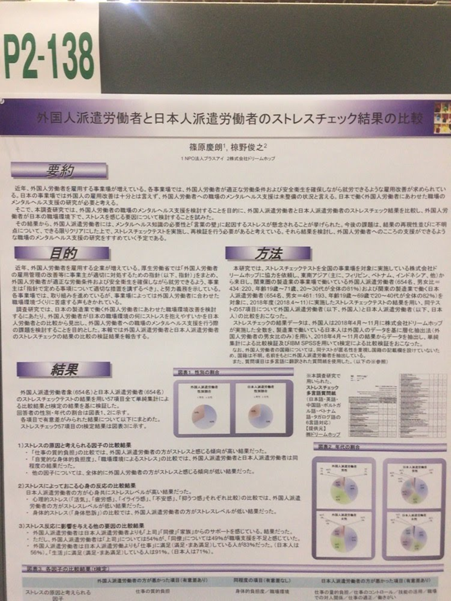 今回で92回になる歴史ある学会なのですが、ストレスチェックが施工されてから3年が過ぎたということもあり様々な研究が活発に行われております。