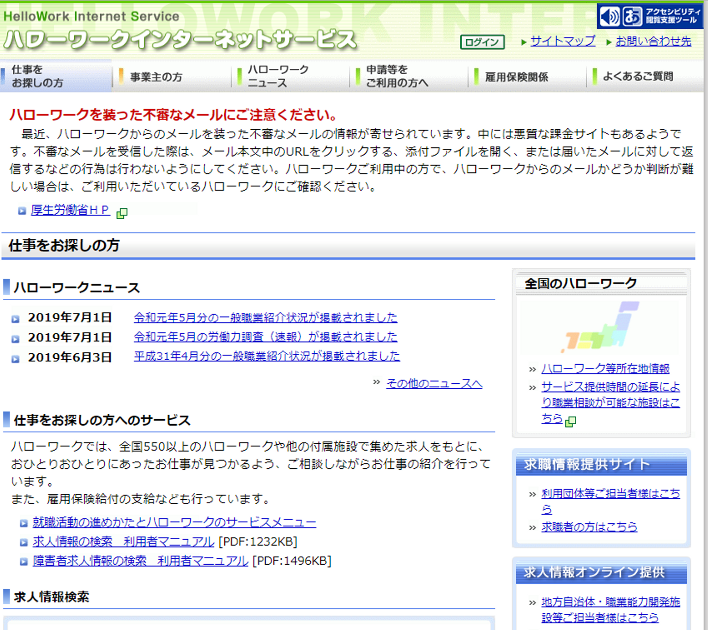*ハローワークインターネットサービス~厚生労働省が運営する、就職支援・雇用促進のためのサイト。求人の検索や雇用保険のお手続き、求人のお申込み手続きや雇用保険・助成金、ハローワークの情報などのサービスを提供しています。(引用先:https://www.hellowork.go.jp/ )