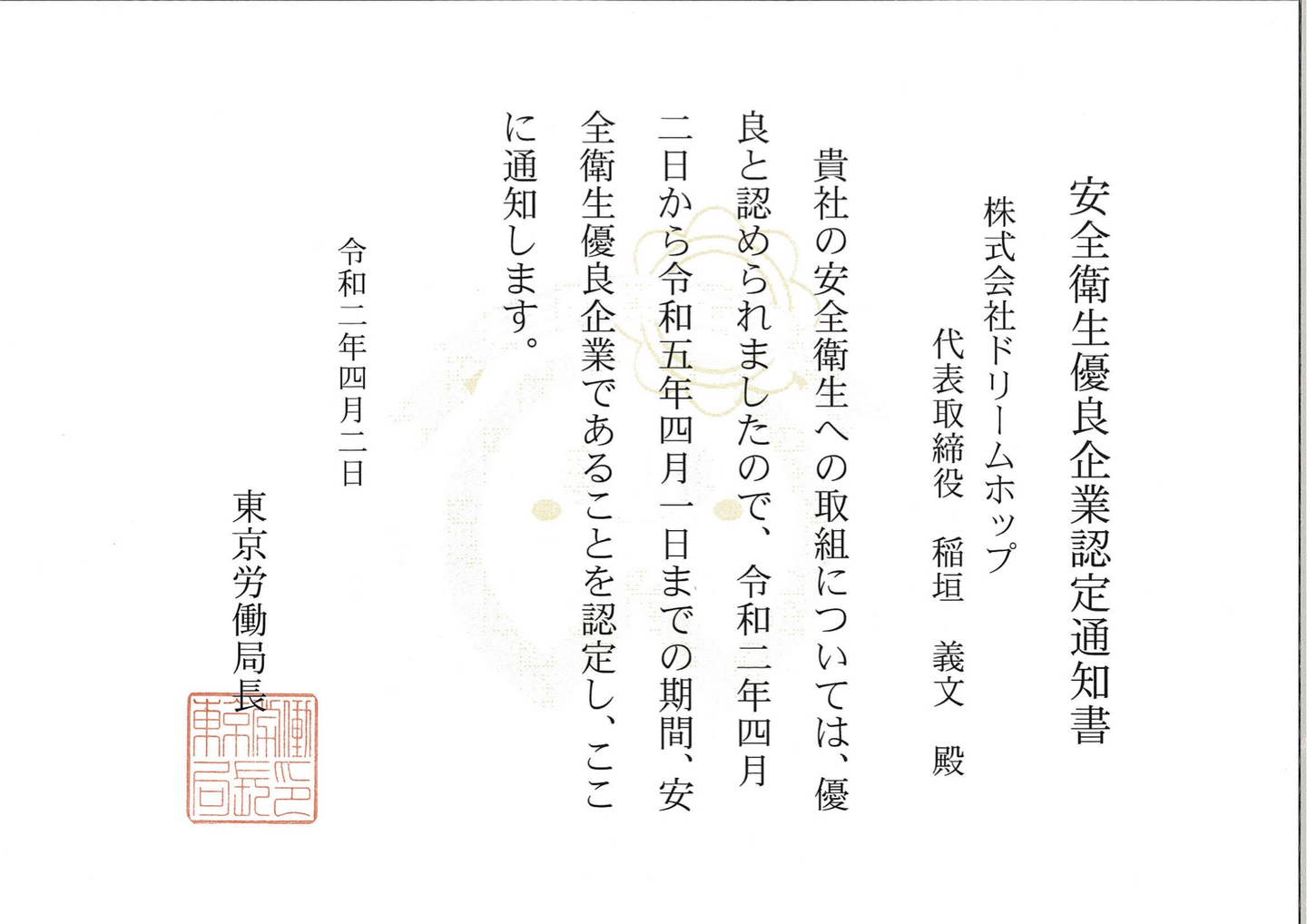 2020年4月2日付で安全衛生優良企業を取得しました!