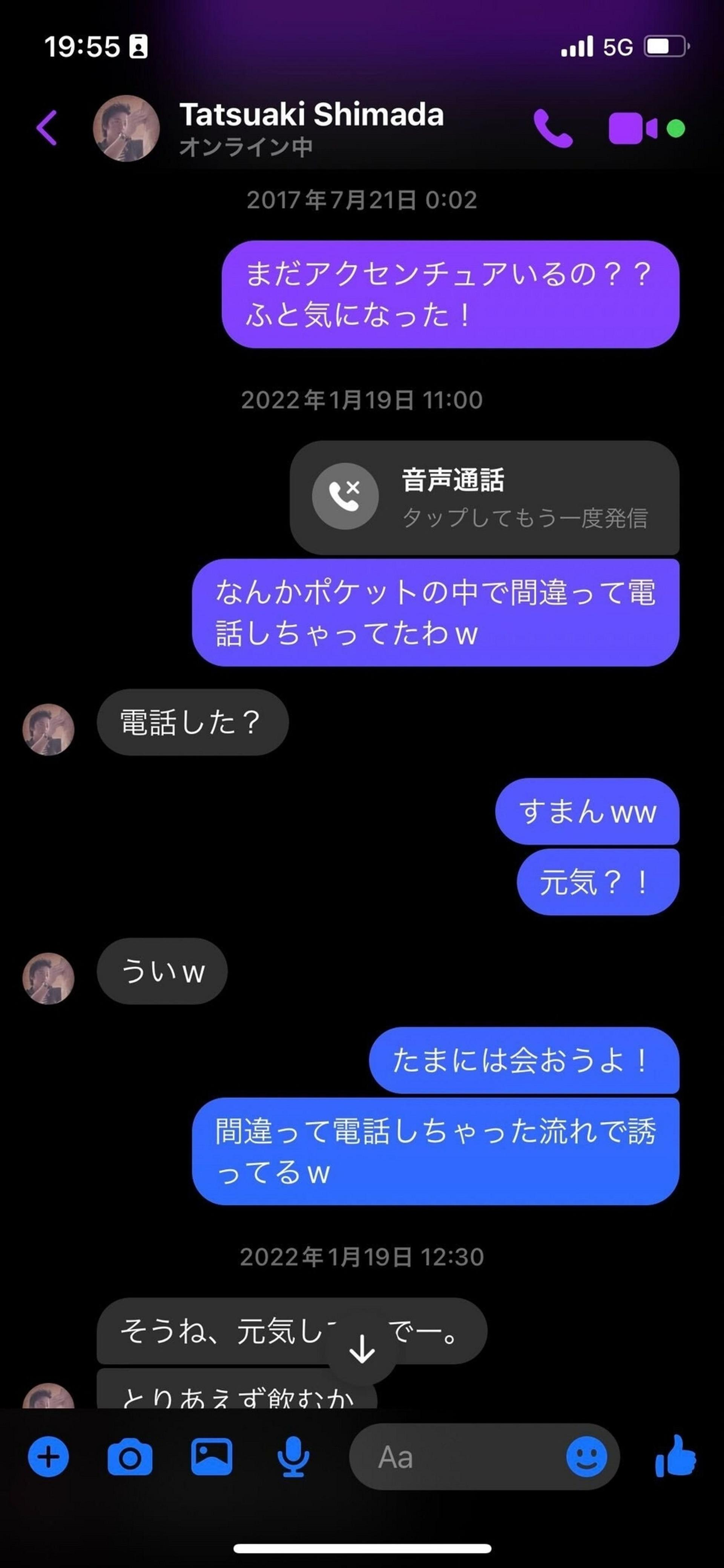 2022年の冬に社長の田からMessengerで電話が来て出れなかったのですが何だろうと思って折り返したら田からも「???」な反応をされて、よくよく聞いたらポケットから勝手にかかった間違い電話ということがわかり、まあ久々に連絡したし後日飲むか、ということになりました。