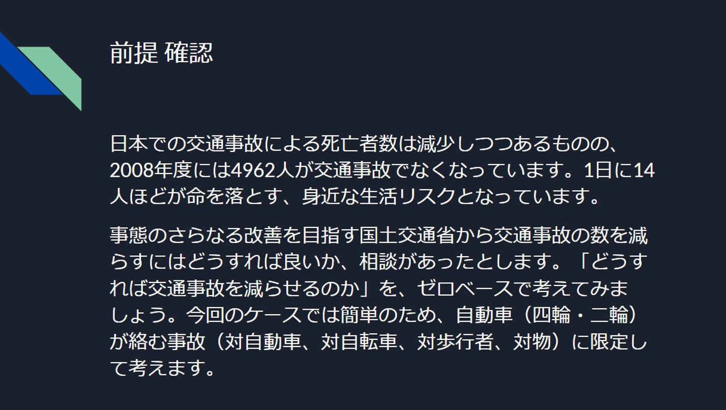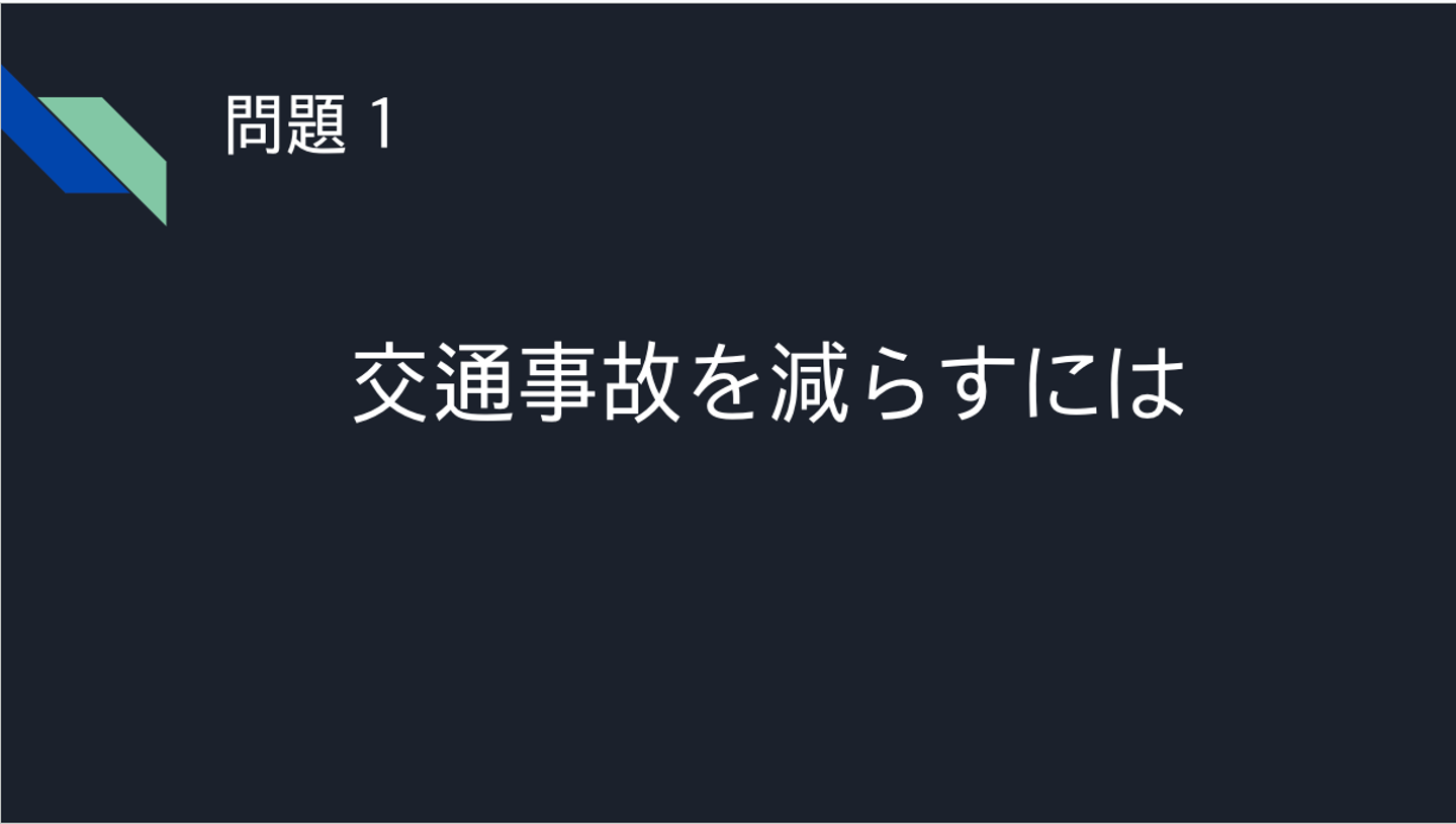 一つ目の問題は「交通事故を減らすには?」にしました。ケーススタディの経験がなかった社員が多かったため、一般的な社会問題にしました。
