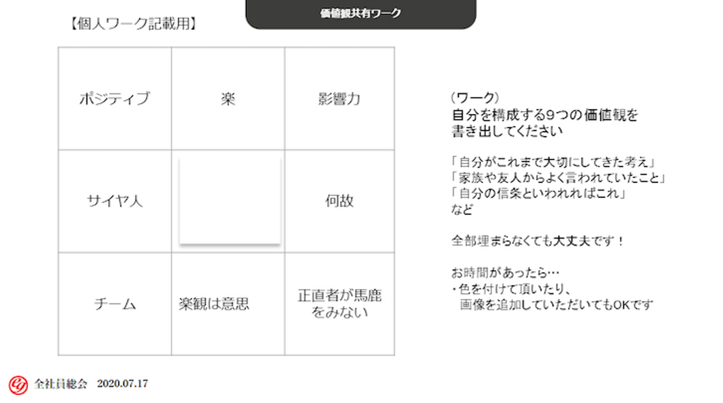 以前サイバーエージェント様がご紹介されていた「価値観9ブロック」というワークを参考にさせていただきました!