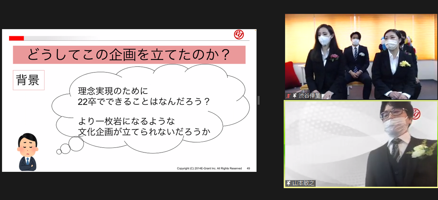 新入社員起案文化醸成コンテンツでは、新入社員のメンバーがE-Grantの文化醸成に向けての新たなプロジェクトを発表いただきました。