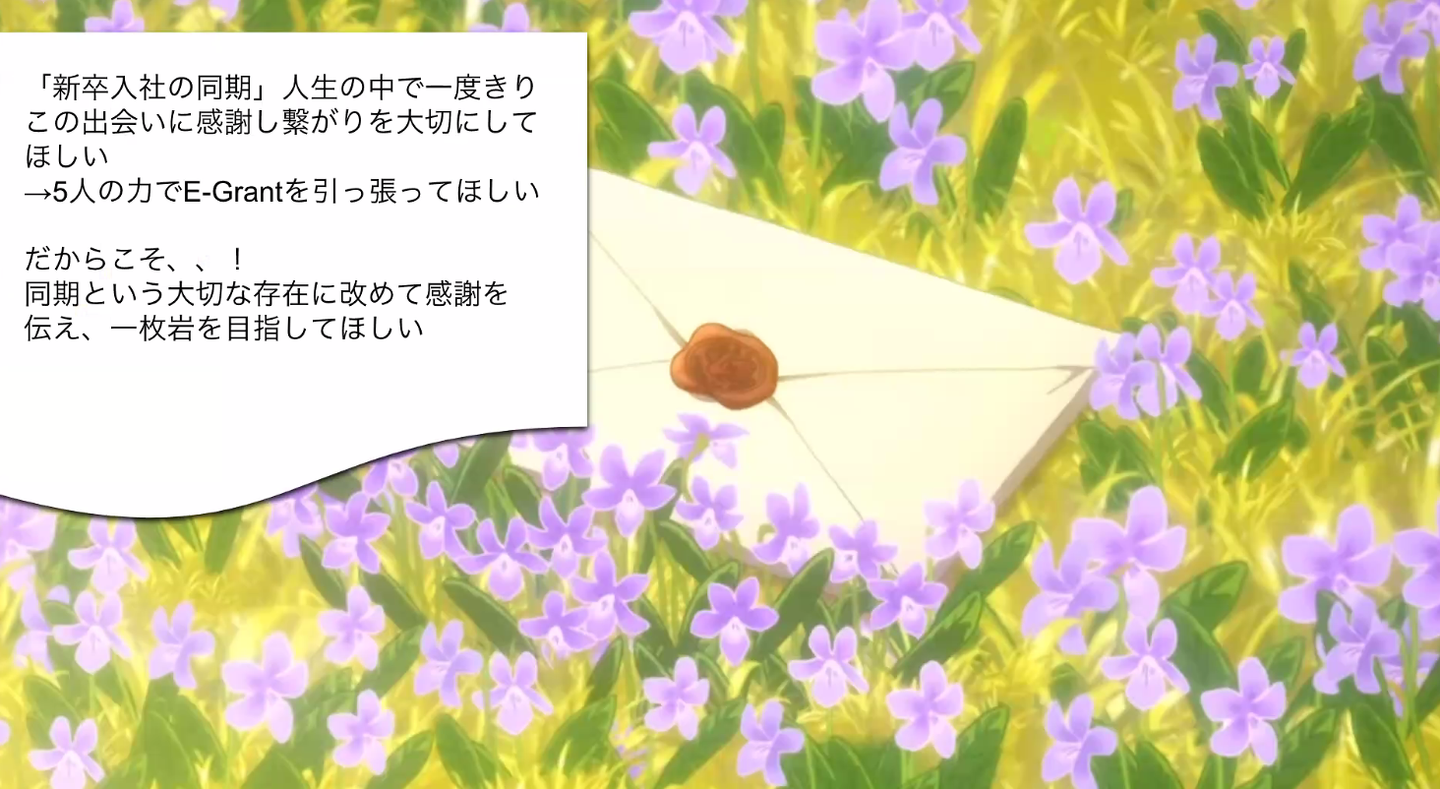 この入社式を通じて、E-Grantの理念や文化が伝わり、新入社員にとってこの入社式が新たな社会人生活の飛躍につながってくれればと思っています。