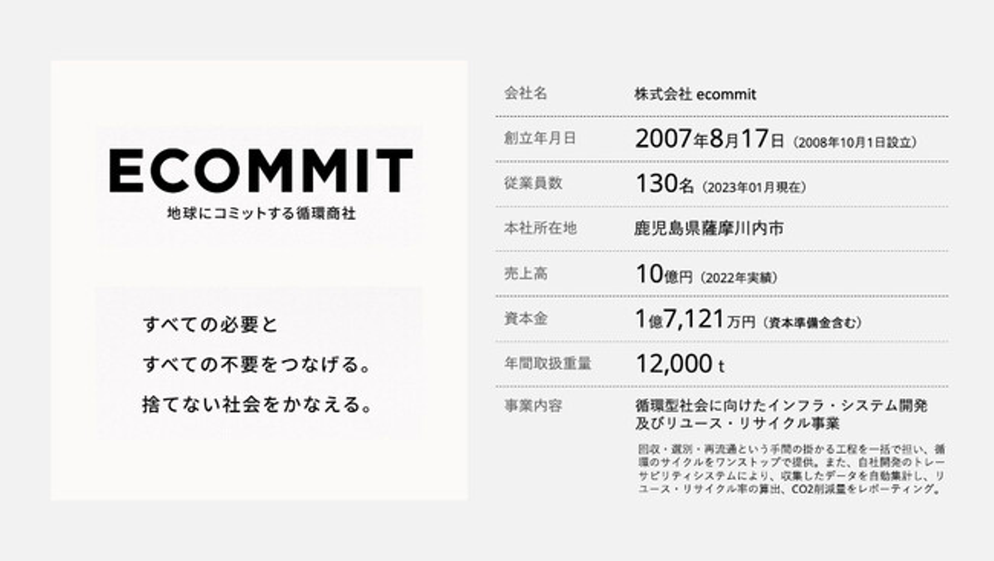 モノの循環の仕組みをつくる環境ベンチャーである株式会社ECOMMIT(本社:鹿児島県薩摩川内市 代表取締役:川野輝之、以下「ECOMMIT」)は、伊藤忠商事株式会社(本社:東京都港区、代表取締役社長COO:石井敬太、以下「伊藤忠商事」)および、株式会社Kips(本社:東京都千代田区、代表取締役:國本行彦)が運用するThe Independents Angel2号投資事業有限責任組合並びにKE投資事業有限責任組合を引受先とする第三者割当増資を実施し、資金調達を行いました。