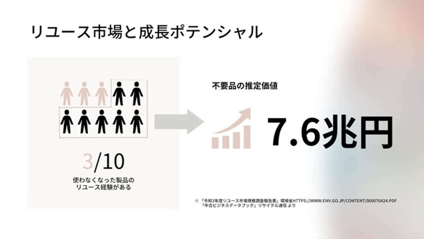 日本のリユース市場は、年間約2.7兆円といわれていますが、日本におけるリユース経験者は約3割に留まっています。リユース経験のない約7割の人たちからも不要品を回収し、循環させることができれば、リユース市場は年間で約7.6兆円まで拡大の余地があるという予測があります。※