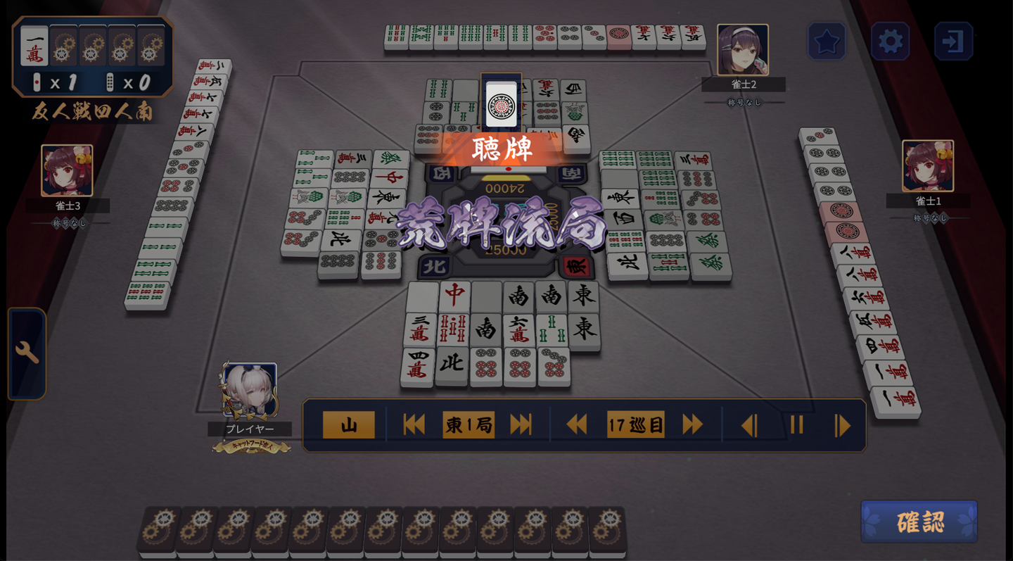 ガリレオ選手の2巡目リーチに押され、流局となりました。この後、東2局も流局となります。