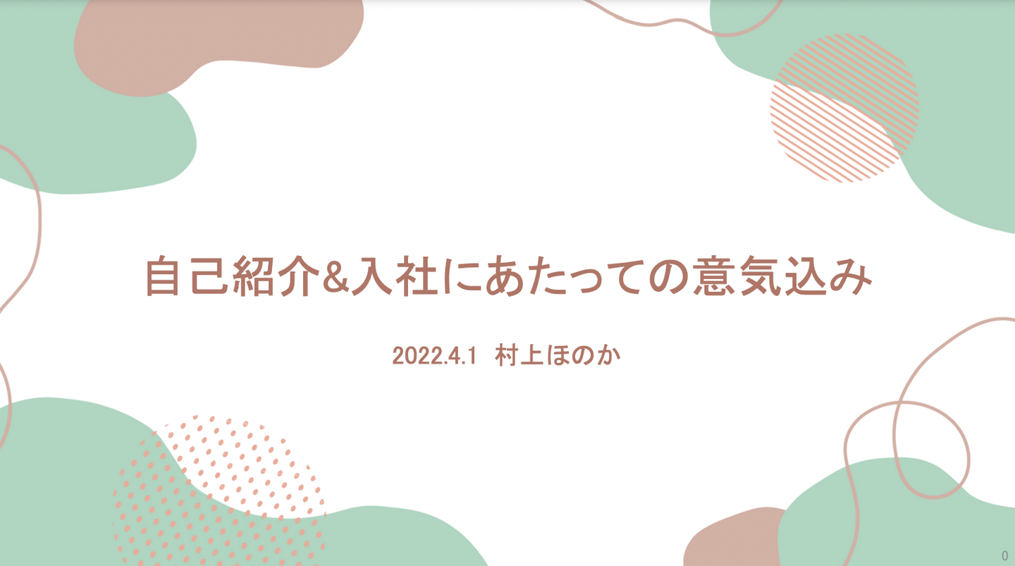 私たち22卒は、初日の一番最初に「自己紹介プレゼン」を行い、事前に作ったPowerPointを投影しながら自分のことや入社にあたっての意気込みを発表しました。もちろん緊張はしましたが、先輩方がちゃんとリアクションを取ってくれたり笑ってくださっていたりしたので、途中からは安心してプレゼンができました。笑