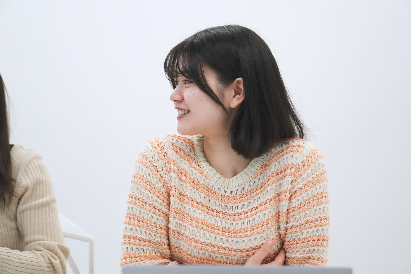 尾﨑「尾﨑舞葉です。私は大学では管理栄養士を目指して勉強していました!3人とは違って表現やデザインを学んでいたわけではないんですが、学生団体でスポーツ栄養指導やフードロス削減と地域活性化の課外活動など幅広くチャレンジしていましたね」