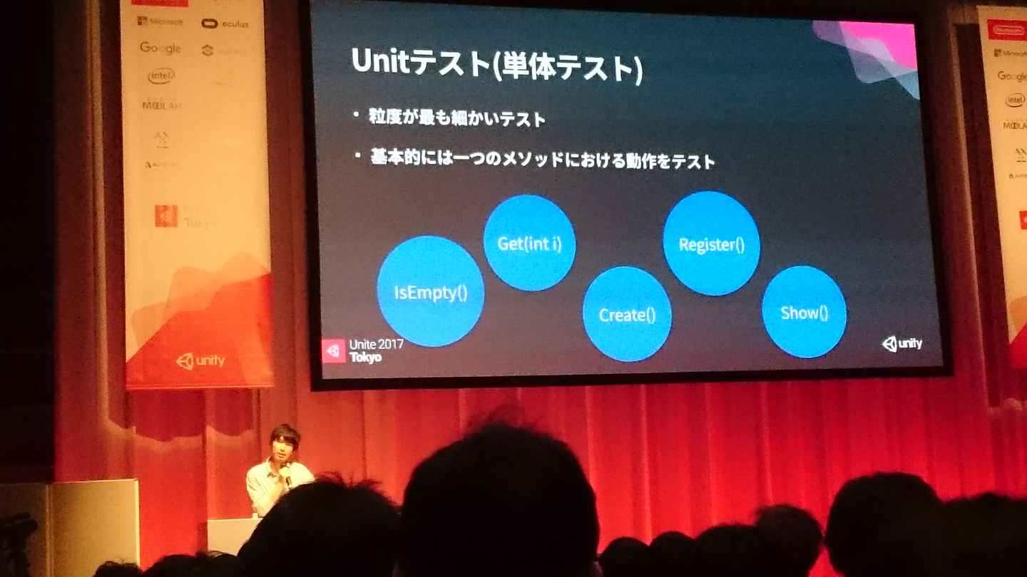 私は1日目の午後に50分間の講演を行いました。タイトルは「バグを殲滅!Unityにおける実践テスト手法」です。Unityにおけるテストの方法やメリット、Unity標準テストの新機能を紹介しました。