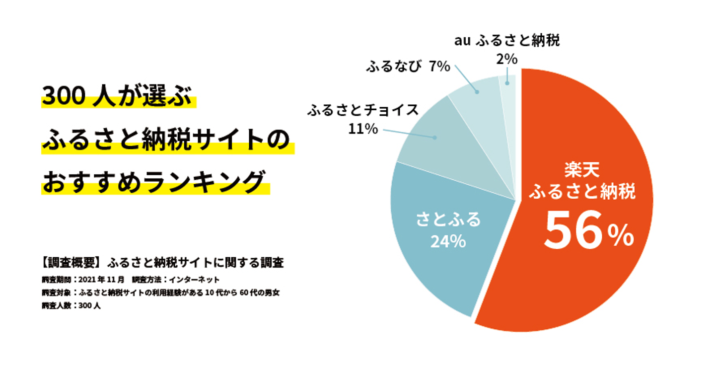 gooふるさと納税が300人を対象に行った「ふるさと納税に関する調査」では、約56%が楽天ふるさと納税を利用しているという調査結果を発表しています。
