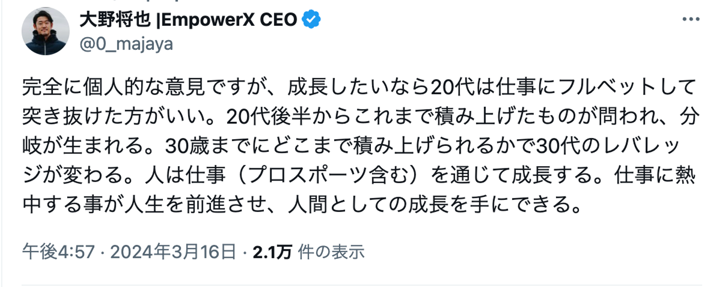 EmpowerXを決めた2つ目の理由は、CEO大野将也のマインドですね。大野さんも成長したいなら20代は仕事にフルベットした方がいいと、お話しされていますが私も同じ意見です。まさに「成長でき、仕事にフルベットできる環境」がEmpowerXだったと言うことです。