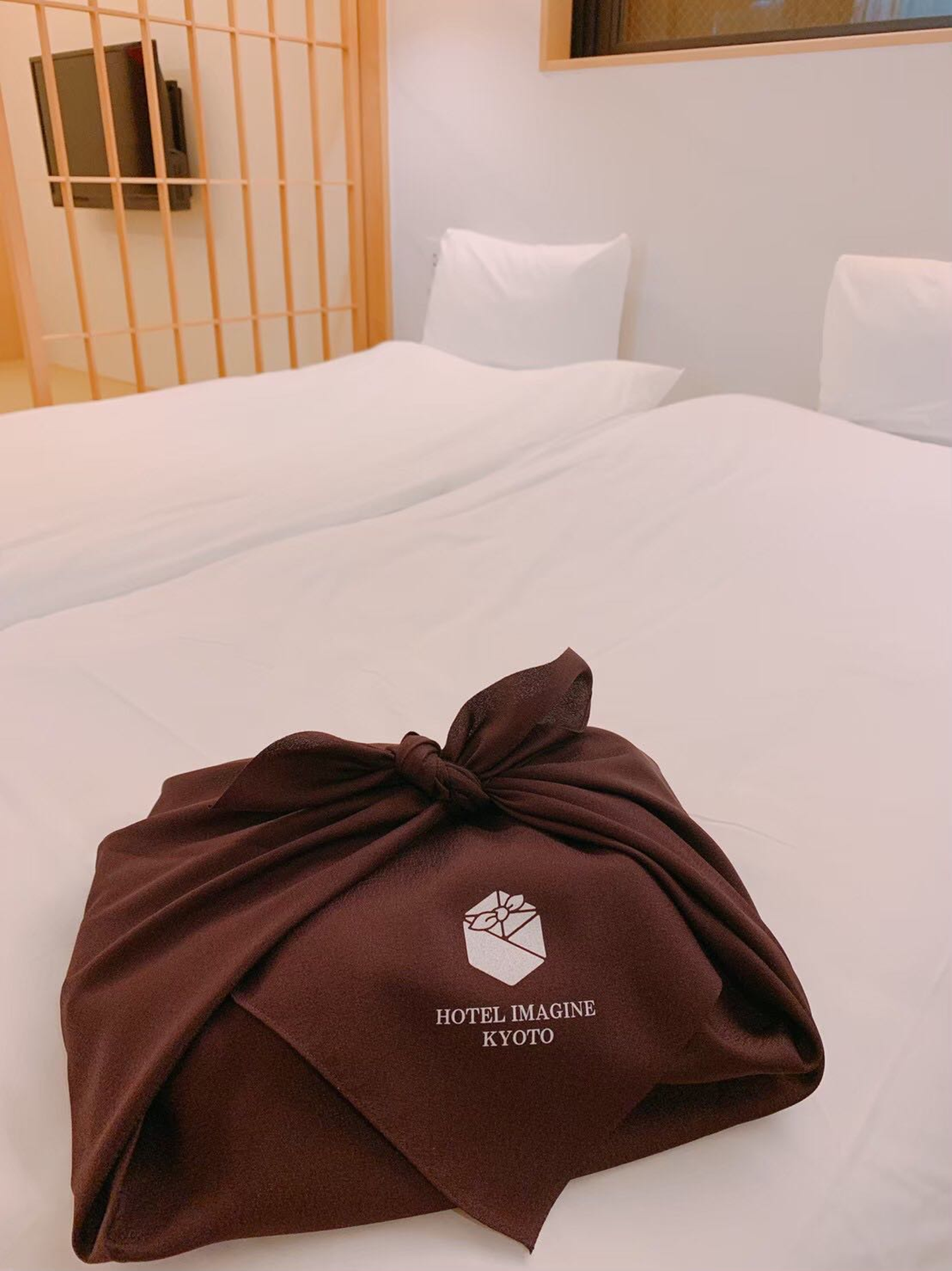 ホテルイマジン京都のホテルロゴは風呂敷を表現してます。風呂敷は大事なイベントごとで活躍する、「日本人の心」を示すもの。風呂敷は、布でできているからどんな形にも臨機応変に対応します。