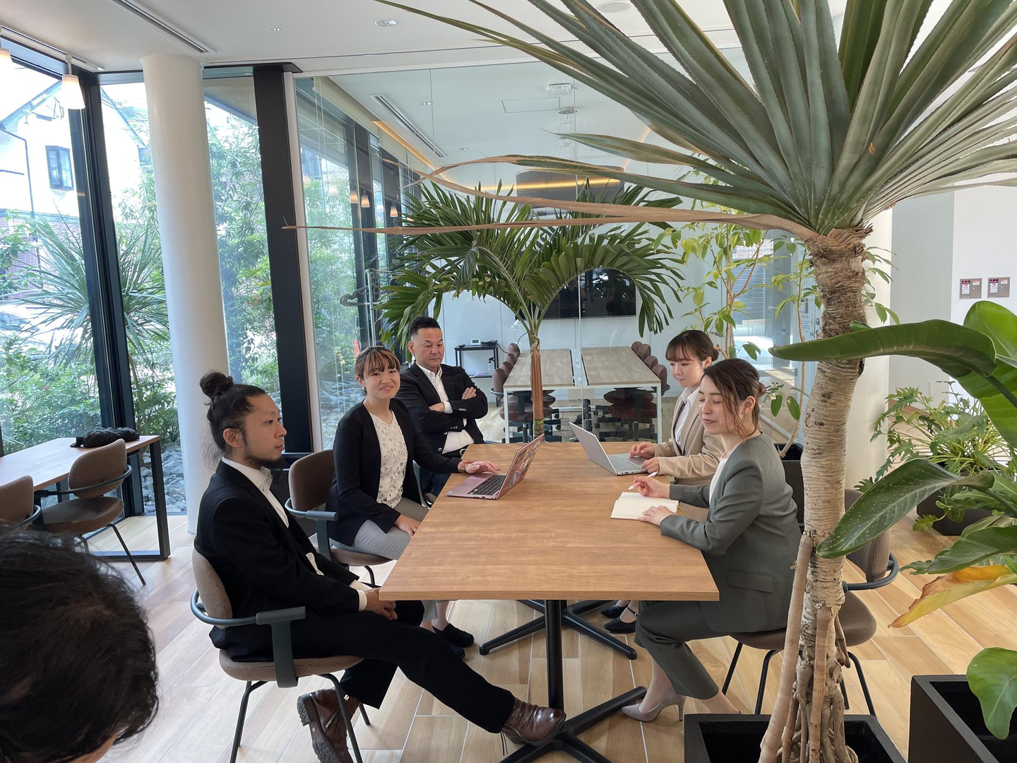 オフィスビル内の家具や樹木で過去一いい仕上がりになった気がします!