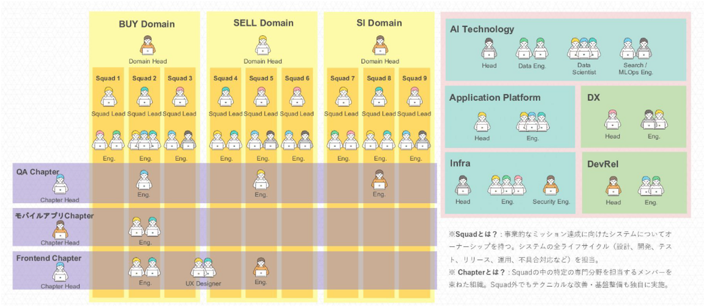 BUYMAの開発体制の全体像・目標とする体制です。3つのDomainをさらに細分化・構造化する形で、縦割りチームのSquadや、横串チームのChapterがあります。さらにDomain/Squadを支援する位置づけの5つのチームがあります。