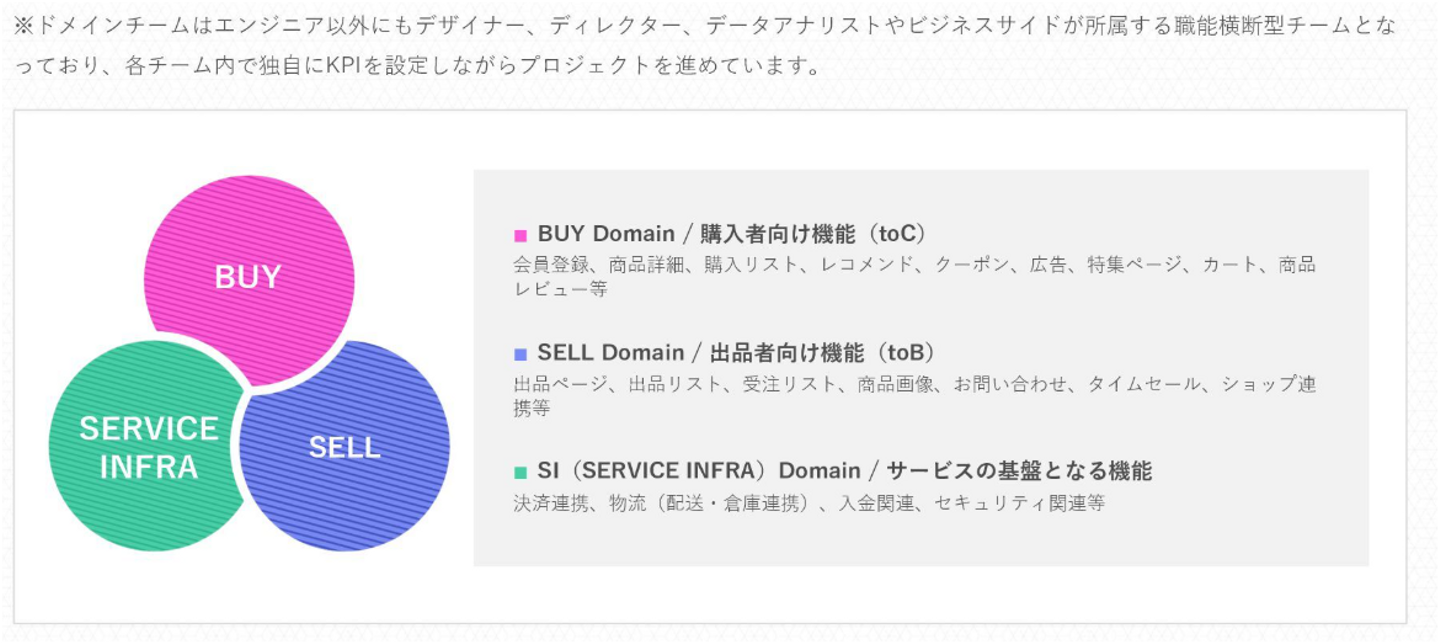 アプリケーション開発グループはBUYMAのドメインごとに、BUYチーム(購入者向け機能)、SELLチーム(出品者向け機能)、SERVICE INFRAチーム(決済や配送などの機能)と、3つのチームに分かれています。